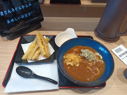 カレーうどんを選択。そして資さんうどんと言えば「ごぼ天(ごぼうの天ぷら)」が定番トッピングと聞くので、そいつも注文。しめて740円(税込)。安っ!